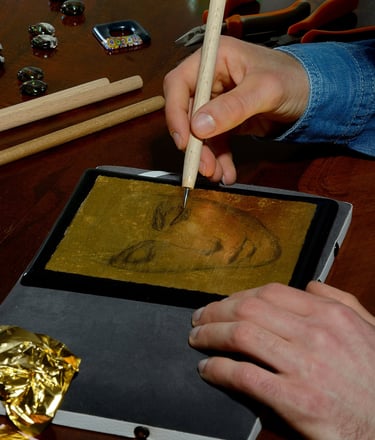 These objects are made using the ancient sgraffito technique on 24-carat pure gold leaf or white gold leaf.
